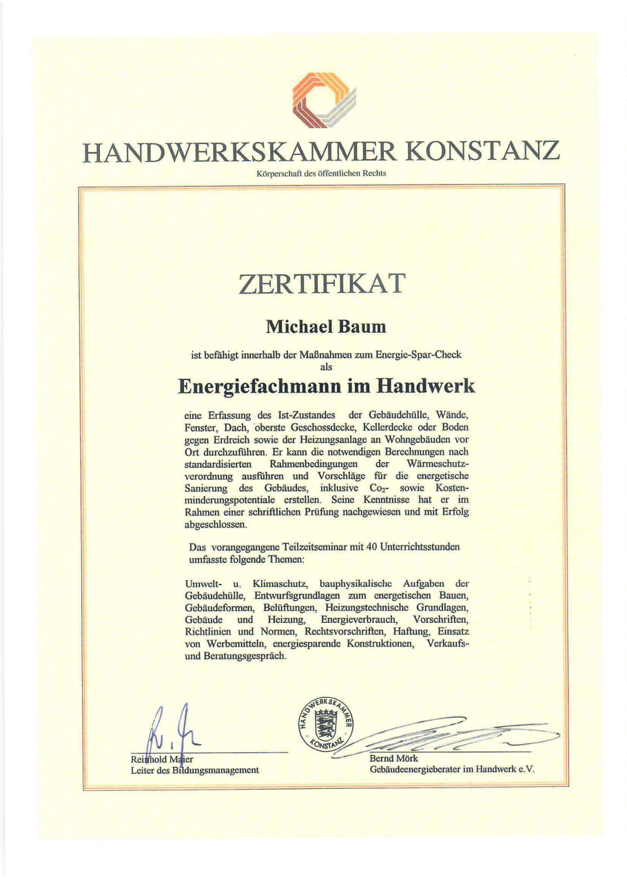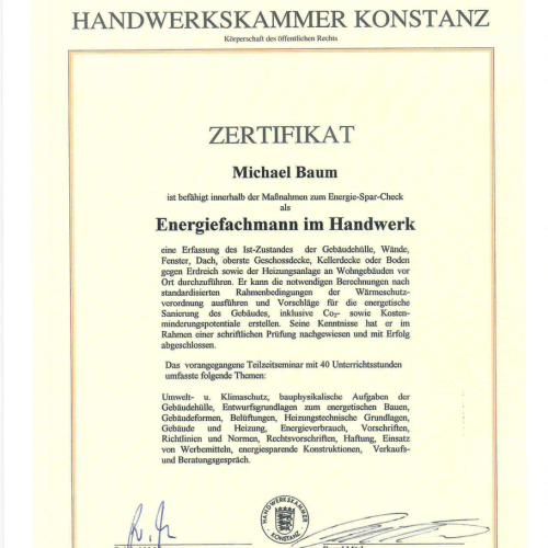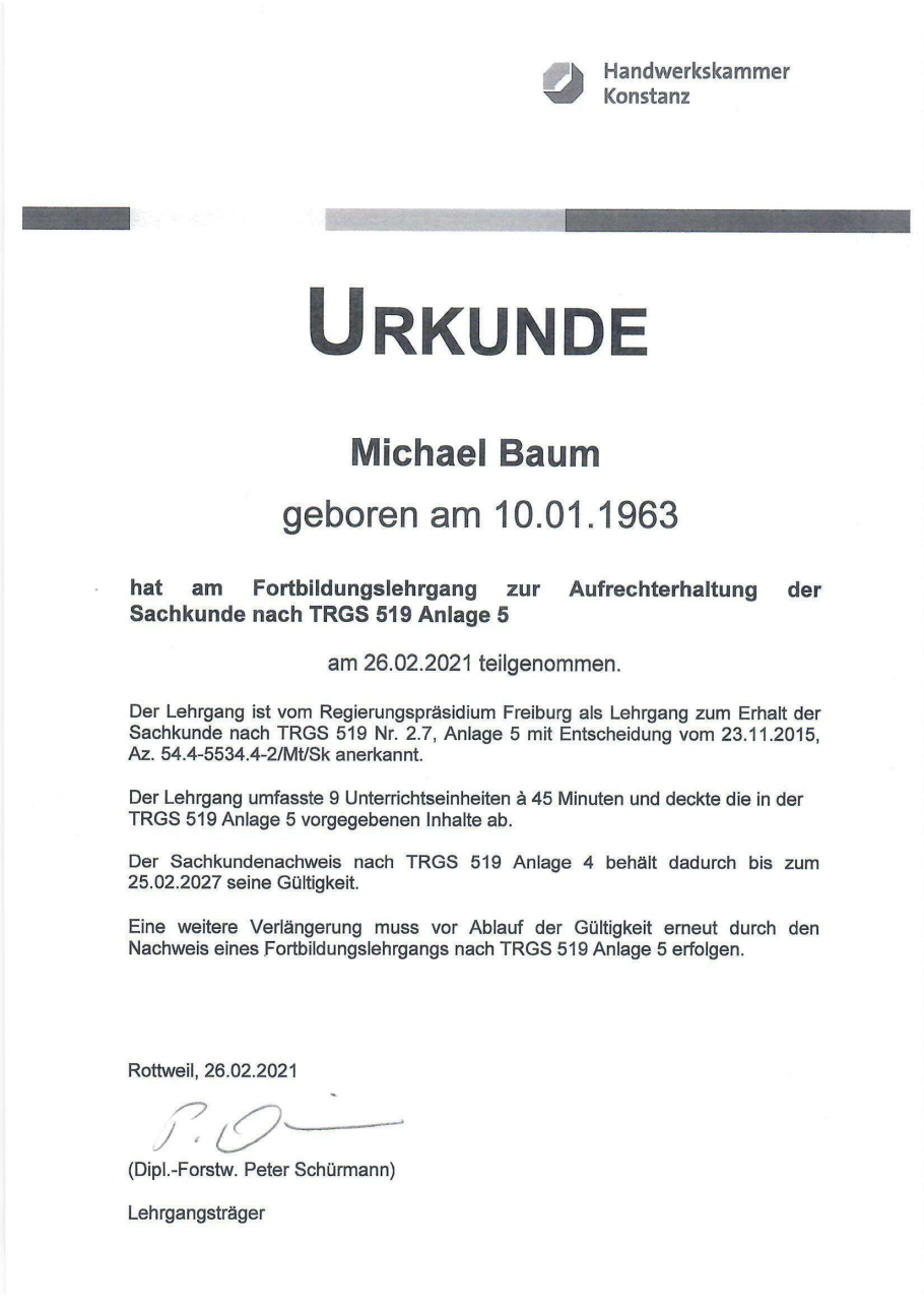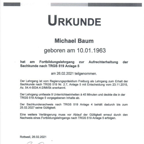 Sachkundiger nach TRGS 519 Asbestzement, durch Handwerkskammer Konstanz.