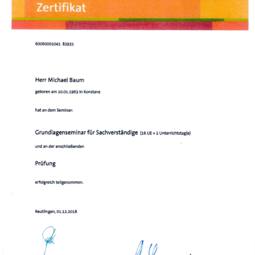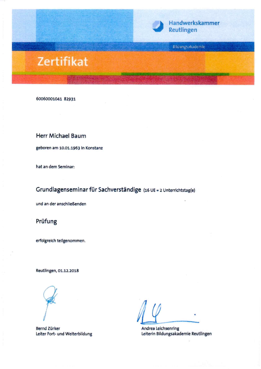 Sachverständigen Grundlagen Prüfung, 2018 durch Handwerkskammer Reutlingen.